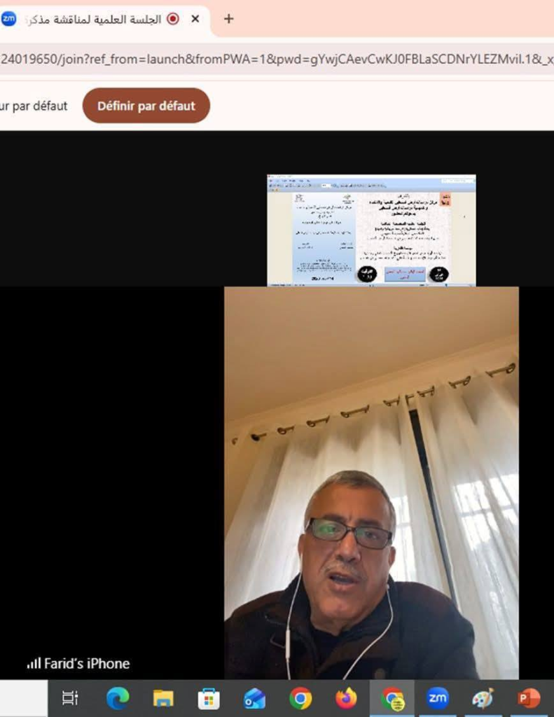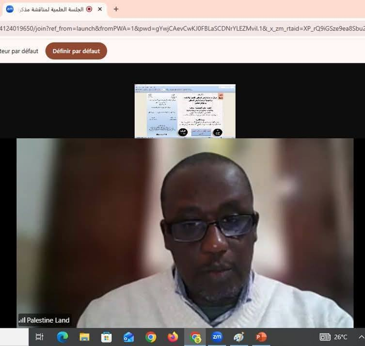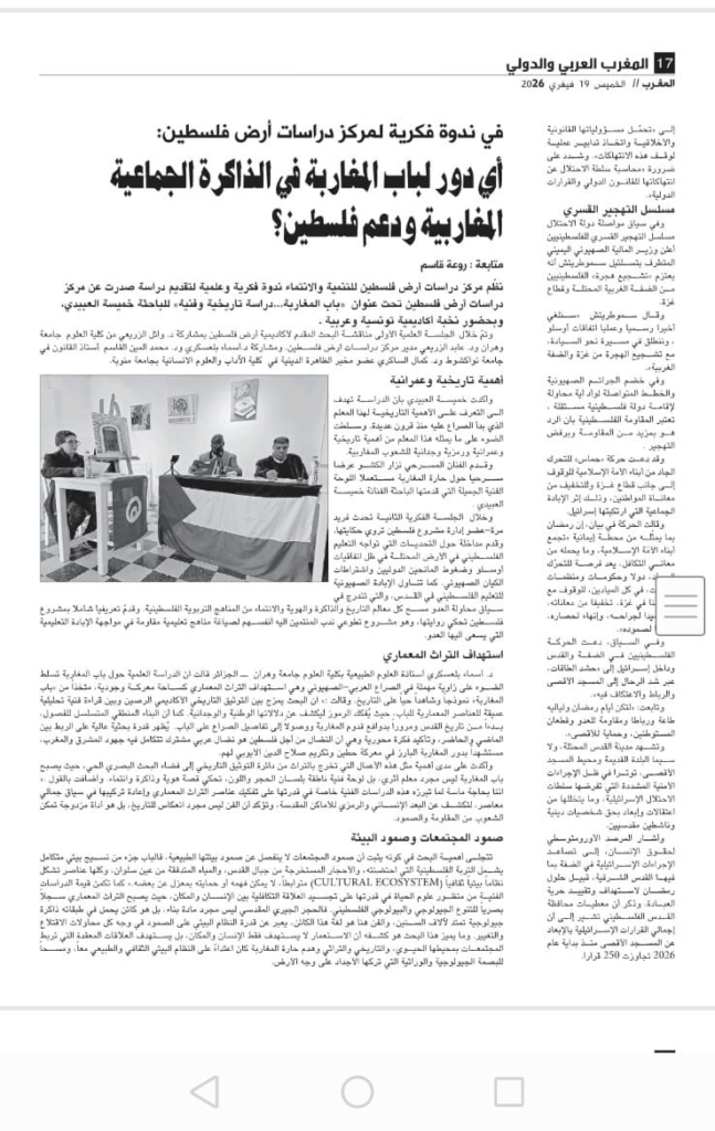 يوم 14 فبراير 2026 لم يكن يوما عاديا بالنسبة لمركز دراسات ارض فلسطين للتنمية والانتماء، وأكاديمية ارض فلسطين، الذراع الأكاديمي للمركز. وقد التقت قامات علمية من فلسطين والجزائر وتونس وموريتانيا، لتناقش البحث المقدم من الطالبة خميسة العبيدي وعنوانه ( باب المغاربة: دراسة تاريخية وفنية) لنيل شهادة البحث التخصصي في دراسات ارض فلسطين. وقد تشكلت لجنة المناقشة من :